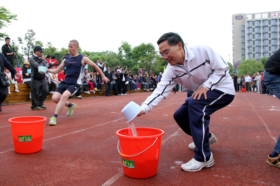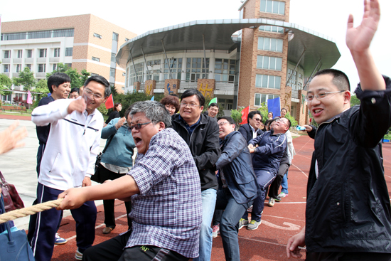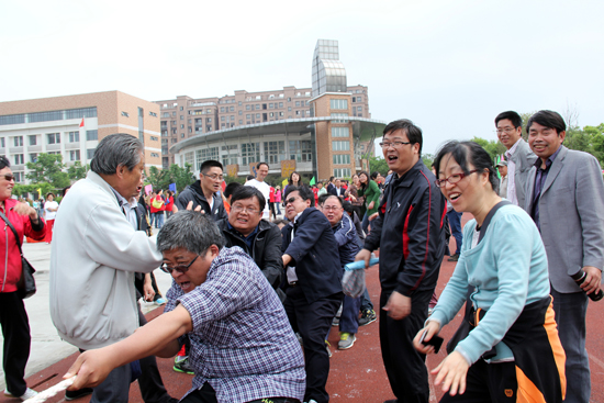 第一项比赛是拔河,哈!我们总支的瞿见宇主委和张弛主委都身先士卒,亲身参战,看:他们正在做赛前的热身准备工作。