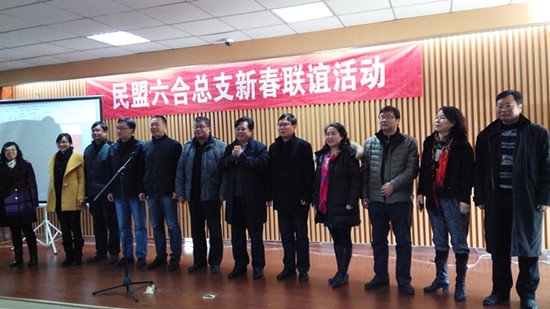 2月18日上午,一年一度的民盟六合区总支新春联谊活动在六合区总工会三楼举行,来自南化、扬子、综合和教育四个支部的80多位盟员齐聚一堂,共迎新春。中共六合区委统战部漆海峰副部长、民盟南京市委组织处黄跃华处长、中共六合区委教育工委许迎新书记出席活动。 首先由区政协副主席、民盟六合总支主委瞿见宇讲话,讲话总结了总支及各支部2015年在社会服务、参政议政和组织建设上取得的成绩,列举了盟员个人在各自工作岗位上取得的业绩,并对总支工作中存在问题进行了分析,对2016年总支工作谈了设想。接着区委统战部漆海峰副部长致辞,致辞充分肯定了民盟六合总支的工作成绩,并对今后民盟继续贴紧全区中心工作、充分发挥党派作用提出了希望。然后民盟南京市委组织处黄跃华处长讲话,在肯定成绩的同时,就总支在基层组织建设、发挥界别优势等方面提出要求。之后,盟员们在一起通过文艺表演、猜谜语、小游戏等方式庆祝新春,其中王家干等人再现了参加市委文艺汇演的节目板胡演奏《幸福年》,现场气氛热烈,大家共同度过了一个愉快的上午。   民盟六合总支