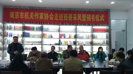 近日,南京民盟盟员周伟、李萍应南京市机关作家协会的邀请,前往西善桥参加采风暨捐书活动。参观了西善桥历史文化博物馆、圣象广场,看了姚南村明墓石刻,“南京记忆”纪念馆等。周伟、李萍向西善桥梅山社区,南京首家社区“金陵书屋”赠送了作品集十余册。
