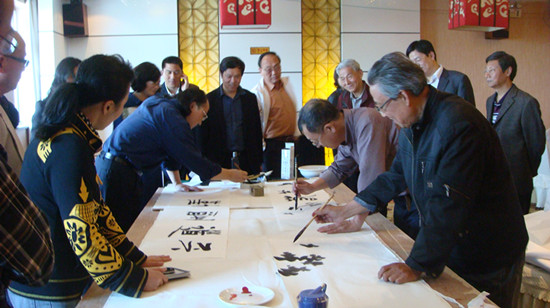 在邗江支部活动室座谈 参观活动室的同时,盟员们先后聆听了邗江区支部主委程毅、扬州盟市委驻会副主委仲子午、盟市委副主委徐卯林关于民盟基层组织工作制度化、规范化建设经验介绍;邗江区委统战部长关于协助对民主党派工作的介绍。固定的活动室,邗江区委给予的经费保证,档案建设的用心和规范,都让南京的盟员羡慕和敬佩。 盟员们还参观了扬州博物馆以及国家级高新技术企业、扬州双鸿电子有限公司,开展了送文化下基层活动。魏万清、黄征、潘敏钟与扬州的书画家盟员一起,现场挥毫泼墨,创作字画30多幅赠送给企业。南京和扬州的盟员还联袂演出,言人、史进、吕少明、惠娟艳、陈菊芳、吴少忠、何苏宁等或一展歌喉、或翩翩起舞,献上了精彩的文艺节目。 .jpg)