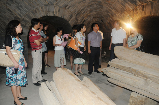 8月30日,民盟南京市委文博支部组织专家考察团,在民盟南京市委驻会副主委戴云的带领下,来到江宁上坊孙吴墓葬和江宁博物馆参观调研。 考察团一行11人首先参观了江宁上坊孙吴墓葬。这座2006年由南京市博物馆考古发掘的孙吴墓葬,是迄今为止发现的规模最大的六朝墓葬,目前已被文物部门就地进行了科学保护。该墓葬的形制和结构非常特别,尤其墓室的顶部和四面墙角构造特殊。墓葬中还首次发现了雕有神兽的巨型覆顶石以及位于墙角的兽首形的石灯台、虎首状石棺座,考察团成员对六朝墓葬的形制产生浓厚兴趣,在现场便进行了分析探讨。 随后考察团前往东晋历史文化博物馆暨江宁博物馆参观,江宁博物馆是全国首家全面展示东晋文化的博物馆,馆内通史陈列清晰展现了拥有50万年人类史的江宁历史文化的发展脉络。陈列展示的展品中,金冥币、阳山碑材场景及沐氏家族墓中出土的明代金冠、镶宝石金经盒等文物引起考察团盟员们的特别关注。这些文化古物的遗存至今使后人对古人的思维产生了猜测和浓厚的兴趣,古人精巧的手工更是得到盟员们的由衷赞叹。 关于江宁的历史和发展,江宁区人大常委会副主任、南京民盟副主委高吉祥在陪同调研时,向文博支部盟员们进行了全面细致的介绍,让盟员们深刻感受到江宁区在文化建设方面以“文化为魂”、充分挖掘文化内涵的各项创新成效。 中国悠久灿烂的历史文化几乎包罗万象,其中文物是历史最直观的语言,文物和文化遗存是古人对今人最直白的经过告白。在对六朝文物和六朝墓葬遗址的考察中,文博支部专家盟员们对六朝文化有了更加深刻的了解,大家一致表示:此次调研活动提供了交流与学习的机会,知识见闻上有了新收获,活动开展的非常有意义。