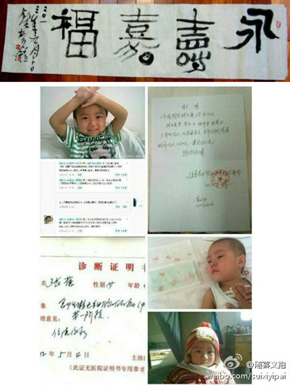 1月12日晚7:50,民盟南京市委委员、文化总支副主委,中国书法家协会会员潘敏钟发布了一条微博:“【永寿嘉福】35×136横批书法一件。捐助河北文安小蓓蓓。@随喜义拍 ,请帮助拍。谢谢!”立即引起博友围观。 起因是潘敏钟通过网络了解到2008年5月出生于河北省廊坊市文安县北史村,才刚刚跨过四岁门槛的张蓓小朋友,在2012年5月被确诊急性淋巴细胞白血病(中危)。经7个月化疗白血病细胞持续残留,急需转院接受配型移植,前期已花费16万,无奈困难家庭实在无力凑够30多万的移植费用。为帮助张蓓小朋友走出病患折磨,新浪微博公益吧面向网络博友发起捐助活动。 为帮助小张蓓,潘敏钟撰写《永寿嘉福》35×136 横批书法一件,义拍筹医疗费!零元起拍,1月13号22点止,价高者得! 潘敏钟在新浪微博发布捐拍消息后,立即引起博友的支持和好评,竞拍者不断,价格从零元开始,在不到两天的时间内,竞拍价从666元到888元再到999元,接着博友从1118元到1234元,再到1800元。最后该副饱含书画家和博友爱心的横幅,被南京市人大代表、国家一级演员、民盟盟员惠娟艳以2000元抢拍得到。 潘敏钟在网拍结束后表示将尽快办理捐赠手续。 .jpg)