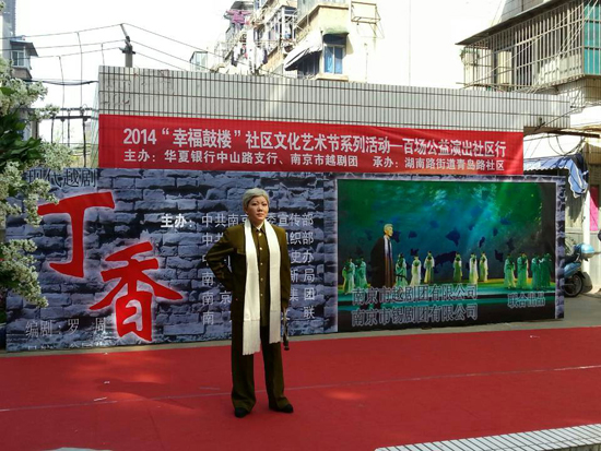 2014年3月27日市越剧团民盟支部盟员孙静、陈菊芳、殷瑞芬、武文玉、陈伟萍、何启忠、张云峰随团参加由市宣传部、组织部、文广新局、文化集团、市文联主办的社区文化艺术节系列活动——百场公益演出社区行。