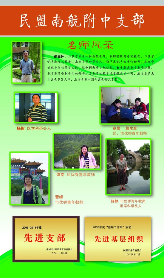 今年支部的活动计划中,我们一直在思考,寻找合适的契机,纪念陶行知先生。因为2011年是陶行知先生诞辰120周年。陶行知先生不仅是伟大的教育思想家,也是中国民主同盟的早期领导人之一,还是民盟南京市委第一任主委。作为主界别为教育界的民主党派,盟员中教师比例很高,纪念陶行知先生,就是让教师盟员充分了解并学习继承他“生活即教育”、“社会即学校”、“教学做合一”的教育思想,为推进教育改革开辟新的理论方向和实践路径;纪念陶行知先生,也是让广大盟员继承他与中共风雨同舟的精神,在新的历史条件下,始终保持与中国共产党同心同向同行,继续坚定不移地走中国特色的社会主义政治发展道路,为南京“十二五”建设做出新的更多的贡献。 同时我们也考虑到支部凝聚了一批名师、骨干教师,这支团队人数不多,但是个个都有值得夸赞的一面。他们以高尚的师德、扎实的业务,教书育人,爱岗敬业,一向淡泊名利,所以我们支部要为盟员搭建宣传平台。为此我们借庆祝第27个教师节之际,结合民盟市委的纪念展板走进校园巡展的时机,庄重而简朴的开展了系列活动:纪念陶行知先生诞辰120周年,以展板的形式在校园宣传;表彰先进盟员,为名师树立形象。 我们于9月7日支部活动时向全体盟员通报了支部被评为2009-2011年度市民盟“先进支部”的喜讯,同时曹峰、戎越频两位老师荣获“先进盟员”的称号。权红老师被民盟省委授予“先进个人”称号。前任老主委向获奖盟员颁发了荣誉证书和奖金,新党委张书记与蒋校长受邀到会并有感而发作了简短的讲话。这是我校发展进入新的上升通道一次有意义的党派交流。 在9月9日在白下区庆祝第二十七个教师节表彰大会上,我校盟员端木彦、袁家风两位老师受到表扬。宣传支部“名师风采”和“缤纷活动”的展板制作完成。民盟市委的宣传展板按时送到学校。 .jpg)