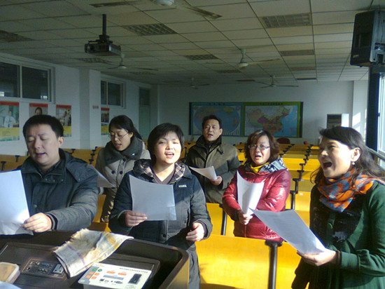 “请各位盟员中午12点半到三号楼507室练习合唱”,在民盟旅游营养支部在职盟员的手机里都有这样的一条信息。旅游营养支部在职盟员有十一位,由于每位盟员工作时间的不同,只有在中午12点半至一点这时间才能集聚在一起。由武瑞玲盟员指导我们练习《走进新时代》这首歌。高音、低音、旋律、重复、节拍起音……每天中午练习着、开心着、欢笑着……宋敬民盟员说“我从未在台上唱过歌,一来就来高难度的”,李晓红盟员说“怎么唱着练着我感到气顺畅多了”“报告,今天我中午临时有会不能来”“今天嗓子不好发不了音,我来听”……有事不能来的除了请假就是自己要补课。在一次小小的活动中又增进了盟员之间的友谊,团结了大家。 “你们的活动那么多彩,是否欢迎我们加入”。每次的活动都能吸引着别人的激情。今年又有两位积极要求加入的准盟员送来了申请报告。活着就要开心,活着就要播撒快乐。 旅游营养支部全体成员祝贺十八大的顺利召开,愿在新一届领导的带领下生活蒸蒸日上,百姓幸福安康,同时预祝秦淮民盟总支在新的来年里带领我们全体盟员走进新的生活。