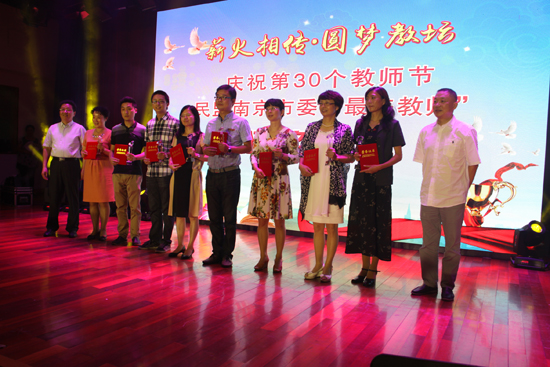 左三为二十七中的丁海峰老师 9月4日下午,在国信大厦四楼的会议室,民盟南京市委举办薪火相传•圆梦教坛----庆祝第30个教师节 “最美教师”颁奖典礼。我校民盟支部丁海峰老师获得“最美教师”称号。 丁海峰老师,担任班主任工作以来,注重班级管理,注重细节,培养习惯。每天的眼保健操都会去教室看看卫生状况,遇有值日生有所疏忽,会亲自拿起抹布扫把,尽力为班级营造良好的学习环境。每周三利用教育学生,统一认识的唯一的一个主阵地----班会课,组织学生轮流举行各式的主题班会,既锻炼了他们的能力,也拓展了他们的视野,为紧张的高中生活松松绑,减减压。做学生的朋友,善于抓住和学生多接触的机会,高二学农中,在地里和学生一起拔树,翻土;元旦班级自己组织的文艺中,亲自上阵和大家一起游乐;运动会中穿上班服和全体同学一起呐喊等等。同时关心每一位同学的学习情况,当他们在学习中出现问题,及时向他们提醒,与他们积极交流,提出有价值的建议;对于有困难的学生,也是尽力帮助,期盼着每一位学生都取得进步,关心每一个,关心这一个。分班后进入高二后丁海峰老师教两个班,一个文科,一个理科,每周课表上有20节课,工作量很大,却毫无怨言。除此以外,长期从事本年级的备课组长工作,积极带领本年级全体数学教师成长,充分调动每一位数学教师的工作热情。丁海峰老师虽然很平凡,但却能在教育教学平凡的岗位上兢兢业业,尽职尽责,无私奉献,让学生感动,令家长感激。 我校党支部朱一峰书记应邀出席了颁奖典礼,同时盟员丁海峰、季庆慧、张兴、丁兆清等老师列席。整个颁奖典礼设计新颖,图文并茂,耳目一新。所有到场者热血沸腾,激发了作为教师的自豪感,感受着民盟大家庭的温暖情怀。颁奖典礼在大家齐唱“五星红旗迎风飘扬……”的热烈气氛中落下帷幕,令人久久难以忘怀……. 二十七中 丁兆清