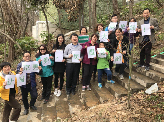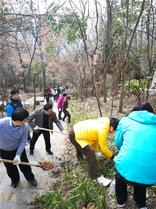 春风吹,吹红了桃花吹绿了杨柳,吹醒了青蛙吹来了燕子,也吹来了一年一度的“植树节”。 2018年3月11日,南京金陵高等职业技术学校双桥门民盟支部响应中山陵园管理局号召,积极参与“我爱紫金山”环保公益活动,借此来提升紫金山登山道生态景观,共同保护母亲山。本次植树节特别活动选择在紫金山华泰登山道这条具有代表性的登山道进行,我支部认养其中20米标准段,栽种吉祥草,争取为游客们提供更好的休闲步道,让紫金山更加美丽更加健康。  早上八点,热情的支部盟员和家属们就早早来到了西马腰认养段,领工具、运土、搬草,分工有序,合作无间。  为了把草种得快又好,老师们变身学生,认真听专家讲解。刨坑、覆土、栽种、浇水,步骤井然,三个小时后荒地立刻春意盎然。 工作虽然繁重,但大家干劲十足,脸上的笑容和回荡的笑声,给初春增添了一抹最美的颜色。  “暮春三月,江南草长,杂花生树,群莺乱飞。” 春日暖阳下,盟员们发挥民盟精神,用自己的劳动,让南京更美,让大地更绿。虽然我们的力量还不够大,但保护环境,我们一直在努力!