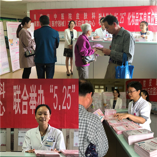 秦淮一总支结合盟员工作,经南京市中医院党办同意,联合南京市不良反应中心在南京市中医院皮肤科诊室外开展“5.25护肤日”公益宣传活动。南京市中医院皮肤科石红乔主任亲临现场为民众做化妆品不良反应的宣传,秦淮一总支盟员黄海梅、司玮等亲临现场协助发放宣传单页、宣传册。