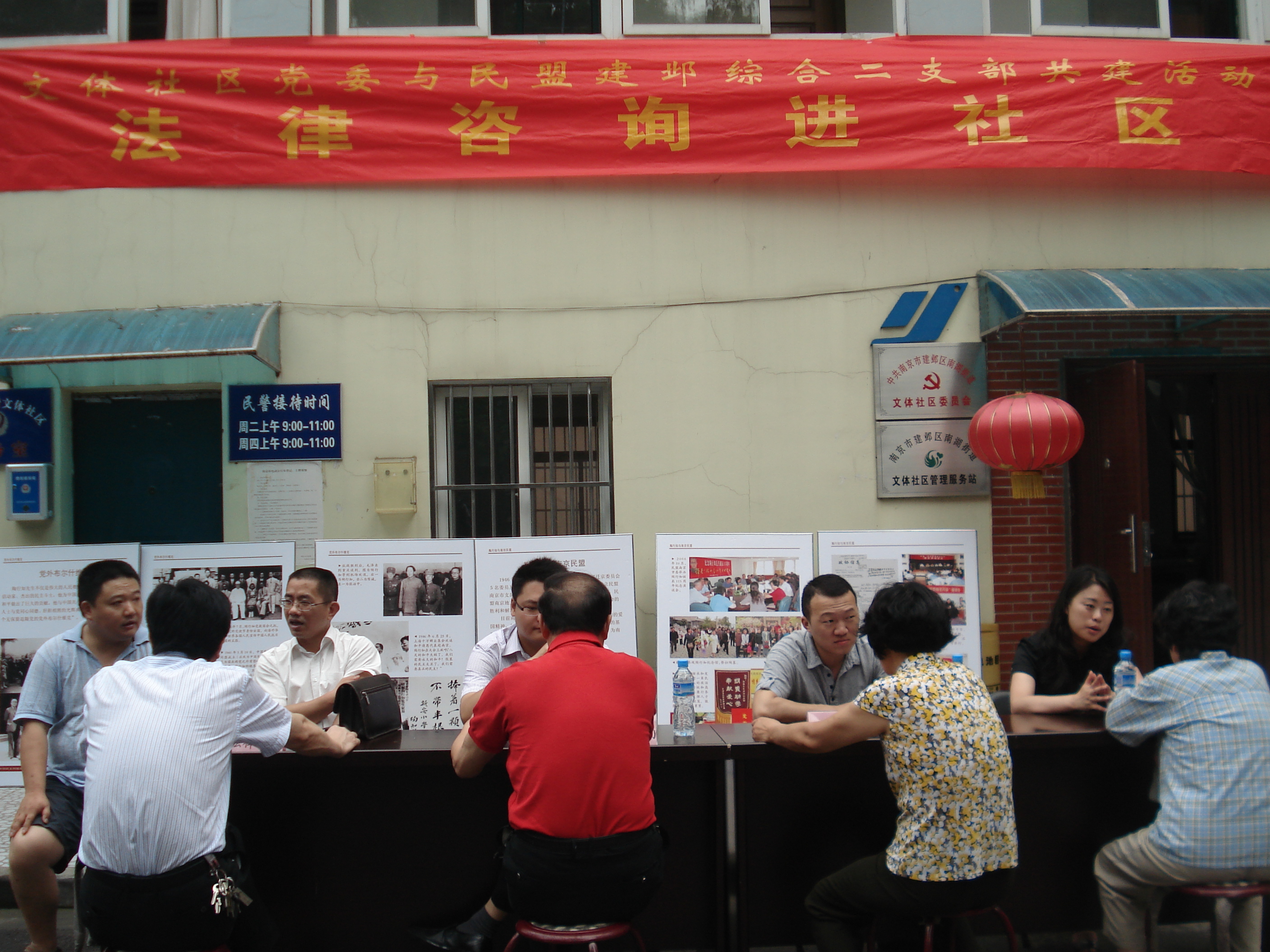 为了纪念建党90周年,民盟成立70周年,陶行知先生诞辰120周年,民盟建邺综合二支部积极发挥党派优势,利用支部法律界盟员较多的优势,和南湖街道文体社区开展了一次有益的共建活动。 .jpg)