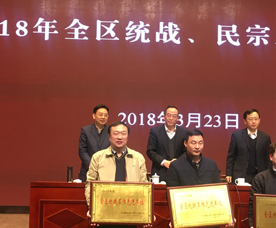 3月23日,栖霞区委统战工作领导小组、栖霞区委统战部在区委党校隆重召开全区统战工作会议,全区各部委办局、各街道社区、驻区高校企业代表、驻区各民主党派、工商联负责人共130多人参加了大会。大会由区委常委、统战部长尹军主持,省民宗局副局长顾传勇和区委常委、区委副书记张志超应邀出席并发表讲话。会议首先由统战部尹军部长对全区2017年统战工作进行总结,并布置2018年度统战重点工作。随后,对2017年度在统战和民宗工作领域做出突出贡献的单位和个人进行了表彰。这是栖霞区首次对统战系统先进单位和个人进行表彰,引起了市委统战部和区委区政府的高度重视,栖霞区委统战工作领导小组多次召开会议酝酿、讨论表彰名单,最终确认并报区委邢正军书记审定通过了十家先进单位和十五名先进个人,民盟栖霞区总支部成为唯一一个获得此项殊荣的民主党派,民盟栖霞区综合支部主委程飞同时获得先进个人称号。这是区委区政府对民盟栖霞区总支部成立以来各项盟务工作的高度肯定和赞扬,也是栖霞区总支部围绕盟市委“五有组织”建设要求积极参政议政的成果体现。  下一步,民盟栖霞区总支部将一如既往的按照盟市委打造“五有组织”的各项要求,紧紧围绕区委区政府中心工作,积极建言献策,抓住“盟员之家”建设契机,为率先达成“五有组织”和建设“强富美高”新栖霞的目标作出应有的贡献。