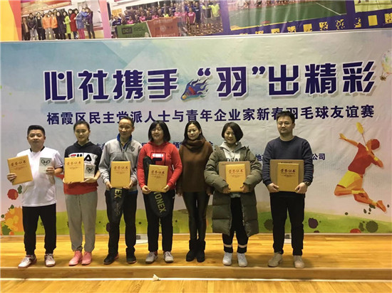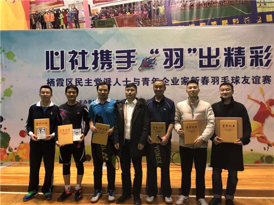 2019年1月5日,心社携手,“羽”出精彩——栖霞区民主党派人士与青年企业家新春羽毛球友谊赛在三宝科技集团羽毛球馆圆满落幕。本次比参赛双方为栖霞区各民主党派友心社和栖霞区工商联青企会。统战部负责人员全程为比赛做了具体的准备组织工作。民盟、民革、致公党、青年企业家代表共28人参加了男单、男双和混双比赛,历经循环赛和淘汰赛两个阶段,进行了多轮激烈的角逐,最终由友心社包揽了三项比赛的冠军,民盟栖霞区总支的作为本次大赛的主力也派出最强阵容参加了比赛,盟员吴枫、刘民、李哲全、李江、孙璐等延续了栖霞民盟勇争第一的传统,经过激烈争夺,获得男单、混双冠军。  整场比赛打的酣畅淋漓,队员们热情饱满、身姿矫健、拿出了赛前演练磨合出的默契,高水平的发球,灵巧的接球回击,大力的扣杀使得场外“好球”的呐喊声不断。尤其男单比赛,高手纷纭,双方选手都充分发挥实力,高水平的对决揪住了观众的心,让比赛高潮迭起,场下队员也积极为队友们加油助威。 活动最后是颁奖和合影,无关名次,大家都面带笑容,心情愉悦,比赛在这轻松愉快的氛围中圆满结束,参赛选手们尽兴而归,在2019年伊始,羽毛球友谊赛的活动,给了盟员们展示盟员形象,交流沟通的平台,大家不仅切磋了球技,也收获了友谊。赛场上盟员们显示出了饱满的精神风貌和团队精神,新的一年,盟员们必将带着胜利的喜悦踏上新的征程。