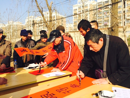 受雨花台区铁心桥街道马家店社区党总支邀请,在新年元旦来临之际,2014年12月30日上午,在刘建祥主委的带领下,雨花台区总支盟员付良恩、毛钧正以及受邀的江苏世博诗画院副院长马学春、秘书长夏国成、国家一级美术师刘仁通教授、书画家刘苏玲老师等艺术家们驱车来到马家店,现场为社区居民写春联。 在活动现场,艺术家们挥毫泼墨,扬扬洒洒,为社区居民写下了100多副春联。艺术家们或笔力遒劲或风格柔婉,将艺术才华与社会服务的精神融入到一幅幅美好的祝愿中去。盟员和艺术家们的到来,得到了社区乡亲们的热烈欢迎,他们对一幅幅凝结着党盟共建,体现着民盟社会服务精神的春联作品赞不绝口,100多副春联被很快索取一空,有的居民还特地从家里拿来红纸要求艺术家们留下墨宝。 深入社区开展社会服务是民盟雨花台区总支的特色之一,民盟雨花台区总支与中共马家店社区总支是多年来的共建单位,今年已是雨花台区总支第二年到马家店社区为居民送春联。活动结束后,马家店社区党工委感谢民盟雨花台总支对社区工作的支持,希望今后能进一步加强合作共建。 .jpg)